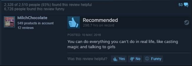 สำหรับระบบ Steam นั้น สิ่งที่แฟน ๆ ชอบใช้กันเป็นประจำ คือฟีเจอร์การเขียนรีวิวเกมของผู้เล่นด้วยกันเอง เพื่อใช้ในการช่วยตัดสินว่าสรุปว่า เราควรจะซื้อเกมนั้น ๆ มาเล่นดีหรือไม่ ถึงแม้ว่ารีวิวบางตัวจากบางผู้เล่นจะไม่ค่อยมีประโยชน์นัก เพราะเหมือนมาระบายอารมณ์ต่าง ๆ มากกว่า แต่รีวิวที่ดีก็มีเพียบ และที่ยอดเยี่ยมยิ่งกว่านั้น คือการรีวิวแบบขำขัน ที่นอกจากจะทำให้เห็นภาพรวมของเกมนั้นได้ดีขึ้นแล้ว ยังได้รอยยิ้มและเสียงหัวเราะจากรีวิวเหล่านี้อีกด้วย วันนี้จะมีรีวิวอะไรจากเกมอะไรกันบ้าง เราได้ลองหยิบมาให้ได้ชมกัน